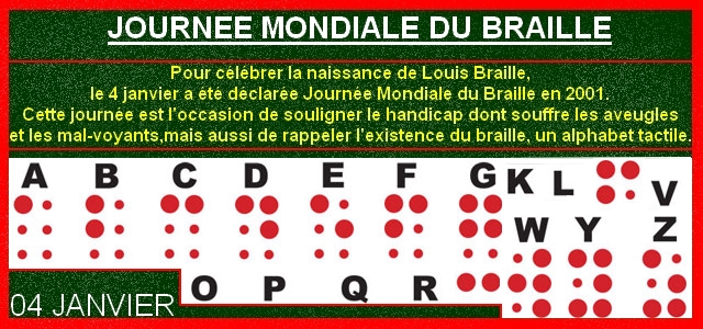 Louis Braille, né le 4 janvier 1809 près de Paris, et mort le 6 janvier 1852, est l’inventeur du système d’écriture tactile à points saillants, à l’usage des personnes aveugles ou fortement malvoyantes : le braille.